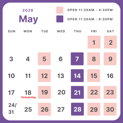| Saturday | 11:30am to 4:30pm *Closed on select Saturdays |