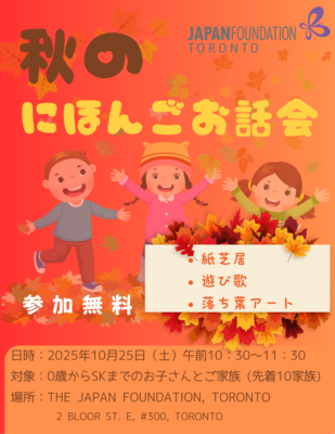 お子さんが日本語に触れる機会を増やしたい方、トロント近郊で日本語育児をされているご家族と繋がりたい方、是非お子さんと一緒にご参加ください。