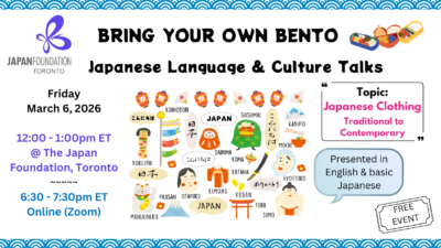 We will hold 2 sessions providing the same content: in-person at the Japan Foundation, Toronto during the lunch hour (12:00-1:00 pm ET) and online in the evening (6:30-7:30 pm ET). If you are near the Yonge/Bloor area in Toronto, why not stop by during your lunch break and learn more about Japanese language and interesting cultural information? Or join us on Zoom in the evening if that better suits your schedule/location. These sessions are B.Y.O.B. (“bring your own bento“), so please feel free to bring your lunch/dinner with you!