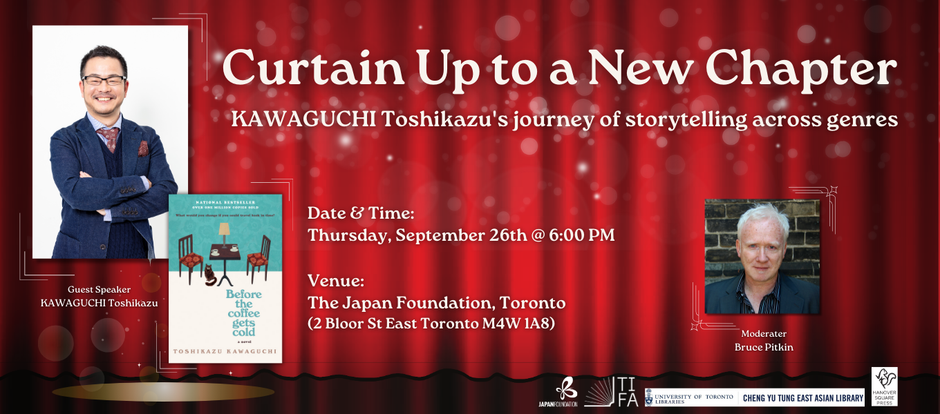 On September 26, Mr. Kawaguchi will converse with Mr. Bruce Pitkin at the Japan Foundation, Toronto about his unique journey of being a playwright turned novelist. The pair will discuss theatre, writing, and translation, making it suitable for enthusiasts of all three to join in. Venturing into the challenges and opportunities the writer has faced in his journey, audience can expect to learn more about the author’s storytelling, which spans genres, as well as hear all about how the café that lets you visit your past came into being.