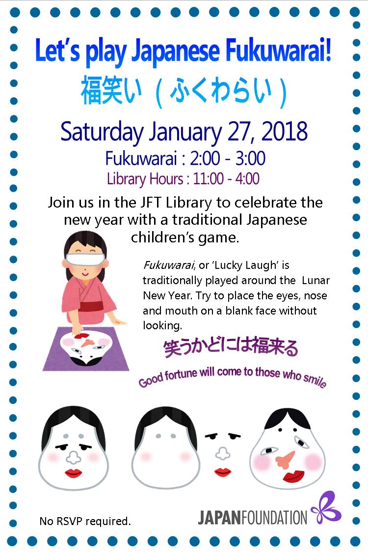 We’ll play Fukuwarai from 2:00 – 3:00pm. Fukuwarai is a children’s game played around the Lunar New Year. Come learn the Japanese words for facial features, and try your hand, playing in pairs to try to place them on a blank face without looking.