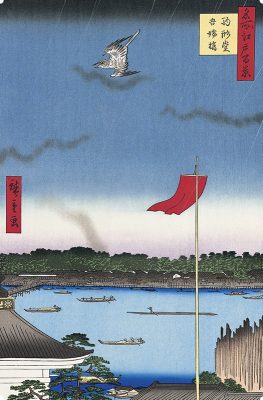 Focusing on a piece from Hiroshige’s Edo 100: Komagatadō Hall, Azumabashi Bridge, 駒形堂吾嬬橋