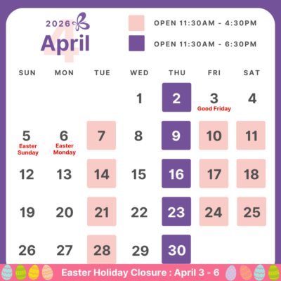 *Closed on Sundays, Mondays, Wednesdays, Select Saturdays, and Public Holidays: