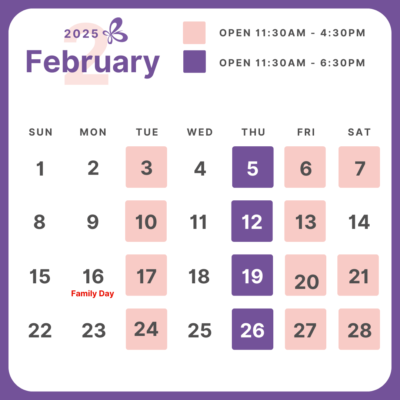 | Saturday | 11:30am to 4:30pm *Closed on select Saturdays |