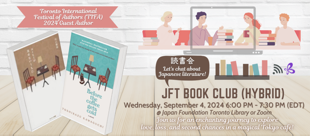 Join us in person or virtually to explore this mesmerizing first book of the global bestselling series! Set in a mysterious café where customers can travel back in time, the novel offers a profound meditation on love, loss, and the choices we make in the flow of time. This book club meeting is a particularly special occasion as we prepare to welcome the author KAWAGUCHI Toshikazu to Toronto! He will be a featured guest at the Toronto International Festival of Authors (TIFA) 2024. Let’s dive deep into this heartwarming and thought-provoking novel together with fellow lovers of literature and Japanese culture!