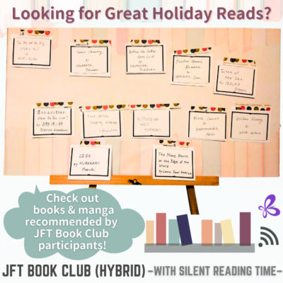 Join our next JFT Book Club (Hybrid) meeting where you are invited to read a book in silence in the library (or wherever you want if participating virtually) and engage in optional discussion with fellow book lovers interested in Japanese culture.