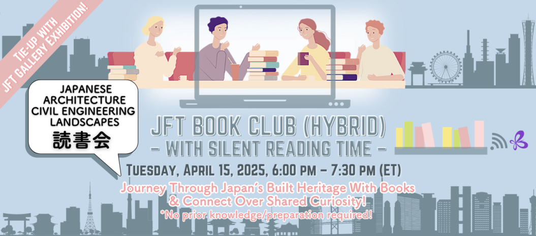 Show WHY JOIN JFT BOOK CLUB “WITH SILENT READING TIME”? Many of us simply want more time to read but cannot squeeze the time in, as we have too many distractions and interruptions in our daily lives to concentrate on reading. JFT Book Club with Silent Reading Time offers a sanctuary to indulge in the simple pleasure of reading, surrounded by fellow book enthusiasts who share your love for literature. In addition, we provide an optional space for those who wish to connect and discuss their reading experiences with others. Engage in conversations at your comfort level and learn new perspectives from other book lovers from different cultural backgrounds that you wouldn’t gain from reading alone! It’s a safe space where your thoughts and impressions are valued, regardless of whether you choose to actively participate or quietly absorb the conversations around you. We welcome both seasoned book club members and first-time participants to discover the joy of silent reading without the pressures of finishing an assigned book on time and/or participating in mandatory discussions. Show HOW DOES THE UPCOMING JFT BOOK CLUB WORK? *There is no right or wrong answer. Different perspectives make the discussion more fun and vibrant! Show *UPDATED* WHAT BOOK TO READ? A book to bring can be either a physical book, ebook, or audiobook (excluding DVDs & Blu-rays) that meets the following criteria: Check out JFT Library’s Book Lists to get ideas! *You can either select a book from the JFT Library’s collection, or bring your own copy from home (can be a book not in JFT library collection if it meets the criteria above). *You can check whether the book is part of our collection by searching on our online catalogue (*to search physical & digital items) or JF Canada/USA Digital Library (*to search and read ebooks & audiobooks). Please contact us if you wish to confirm the availability with us. To get a new JFT library card or to renew your existing card, please follow the instructions found here. Built Environment: An Alternative Guide to Japan March 13, 2025 – July 15, 2025 The exhibition features 80 examples of buildings, civil engineering works and landscapes, etc., from all of the prefectures in Japan, which are introduced through photographs, text and video images. It presents a rarely considered aspect of Japan, taking the built environment of the various regions of a country that is geographically diverse and often struck by natural disasters, with the aim of examining how Japanese people have engaged and struggled with the natural environment and how they have carried on and created locality. Japanese Tadoku Book Club – October 26, 2024WHY JOIN JFT BOOK CLUB “WITH SILENT READING TIME”?