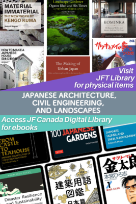 Show WHY JOIN JFT BOOK CLUB “WITH SILENT READING TIME”? Many of us simply want more time to read but cannot squeeze the time in, as we have too many distractions and interruptions in our daily lives to concentrate on reading. JFT Book Club with Silent Reading Time offers a sanctuary to indulge in the simple pleasure of reading, surrounded by fellow book enthusiasts who share your love for literature. In addition, we provide an optional space for those who wish to connect and discuss their reading experiences with others. Engage in conversations at your comfort level and learn new perspectives from other book lovers from different cultural backgrounds that you wouldn’t gain from reading alone! It’s a safe space where your thoughts and impressions are valued, regardless of whether you choose to actively participate or quietly absorb the conversations around you. We welcome both seasoned book club members and first-time participants to discover the joy of silent reading without the pressures of finishing an assigned book on time and/or participating in mandatory discussions. Show HOW DOES THE UPCOMING JFT BOOK CLUB WORK? *There is no right or wrong answer. Different perspectives make the discussion more fun and vibrant! Show *UPDATED* WHAT BOOK TO READ? A book to bring can be either a physical book, ebook, or audiobook (excluding DVDs & Blu-rays) that meets the following criteria: Check out JFT Library’s Book Lists to get ideas! *You can either select a book from the JFT Library’s collection, or bring your own copy from home (can be a book not in JFT library collection if it meets the criteria above). *You can check whether the book is part of our collection by searching on our online catalogue (*to search physical & digital items) or JF Canada/USA Digital Library (*to search and read ebooks & audiobooks). Please contact us if you wish to confirm the availability with us. To get a new JFT library card or to renew your existing card, please follow the instructions found here. Built Environment: An Alternative Guide to Japan March 13, 2025 – July 15, 2025 The exhibition features 80 examples of buildings, civil engineering works and landscapes, etc., from all of the prefectures in Japan, which are introduced through photographs, text and video images. It presents a rarely considered aspect of Japan, taking the built environment of the various regions of a country that is geographically diverse and often struck by natural disasters, with the aim of examining how Japanese people have engaged and struggled with the natural environment and how they have carried on and created locality. Japanese Tadoku Book Club – October 26, 2024WHY JOIN JFT BOOK CLUB “WITH SILENT READING TIME”?