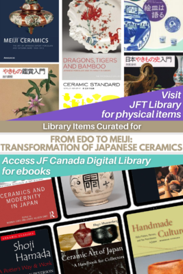 - Theme: The JFT Gallery Exhibition “From Edo to Meiji: Transformation of Japanese Ceramics” (i.e., fiction, nonfiction, or manga about Japanese Ceramics ; fiction, nonfiction, or manga portraying Japanese culture and society in Edo (1603-1867) and/or Meiji (1867-1912) periods)