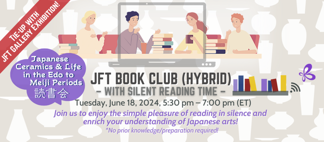 Join our next JFT Book Club (Hybrid) meeting where you are invited to read a book in silence in the library (or wherever you want if participating virtually) and engage in optional discussion with fellow book lovers interested in Japanese arts. Inspired by the JFT Gallery’s current exhibition, our upcoming book club meeting invites you to explore the beauty of Japanese ceramics and life from the Edo (1603-1868) to Meiji (1868-1912) periods.