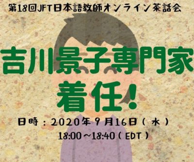 今回のJFT日本語教師オンライン茶話会は、8月28日に着任の国際交流基金派遣日本語上級専門家、兼、アルバータ州教育省日本語教育アドバイザーの吉川景子専門家の自己紹介と懇親会です。吉川専門家やカナダ各地の先生方とお話ししたい方々、是非、ご参加ください!