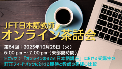 JFT 日本語教師オンライン茶話会では、授業で実践したことや感じていることなどを小グループで共有し合います。これからしてみたいと思っているアイデアや、ちょっと行き詰まっているなと感じていることなどでもかまいません。普段なかなか会えないカナダ各地の先生方とお話してみませんか。