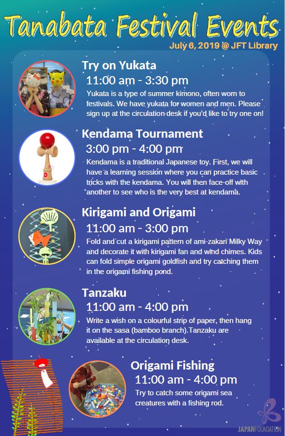 The JFT Library will be open 11:00am – 4:00pm for Tanabata, also known as the Star Festival.