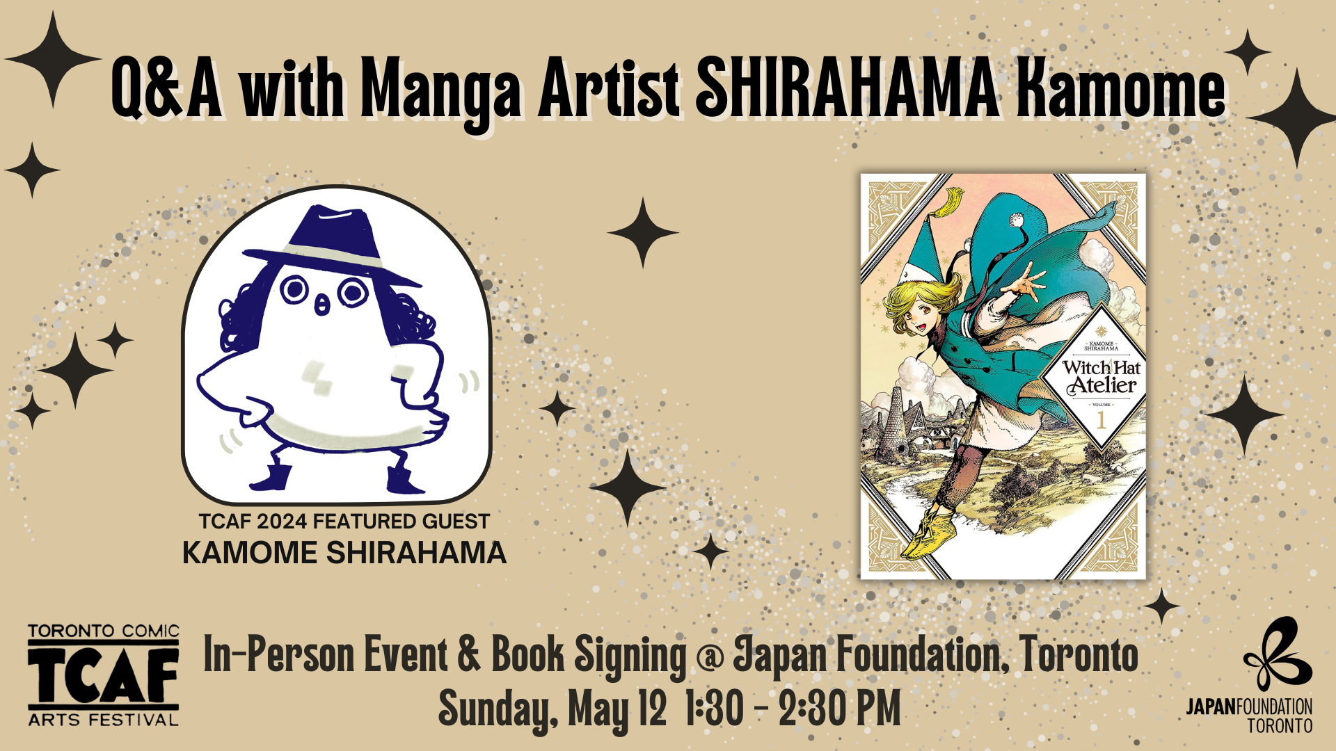 Join us to welcome SHIRAHAMA Kamome, an esteemed manga artist of the award-winning series, Witch Hat Atelier! Ms. Shirahama is stopping by JFT on Sunday, May 12, as a featured guest of Toronto Comic Arts Festival 2024 (May 11-12, 2024).