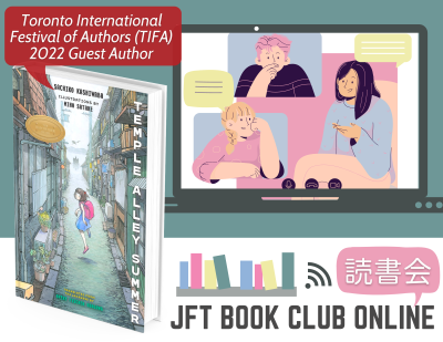 For the upcoming JFT Book Club Online, we will discuss KASHIWABA Sachiko’s Temple Alley Summer (帰命寺横丁の夏), which won the American Library Association’s Batchelder Award this year. Ms. KASHIWABA will be one of the featured authors of the Toronto International Festival of Authors 2022. Join our virtual conversation about this sweet ghost story in the lead-up to Ms. KASHIWABA’s TIFA appearance on September 24!