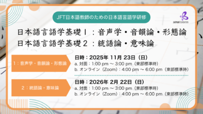 JFT Linguistics Workshop for Japanese Language Teachers: 日本語言語学基礎1(音声学・音韻論・形態論)、基礎2(統語論・意味論)