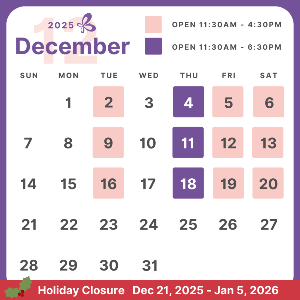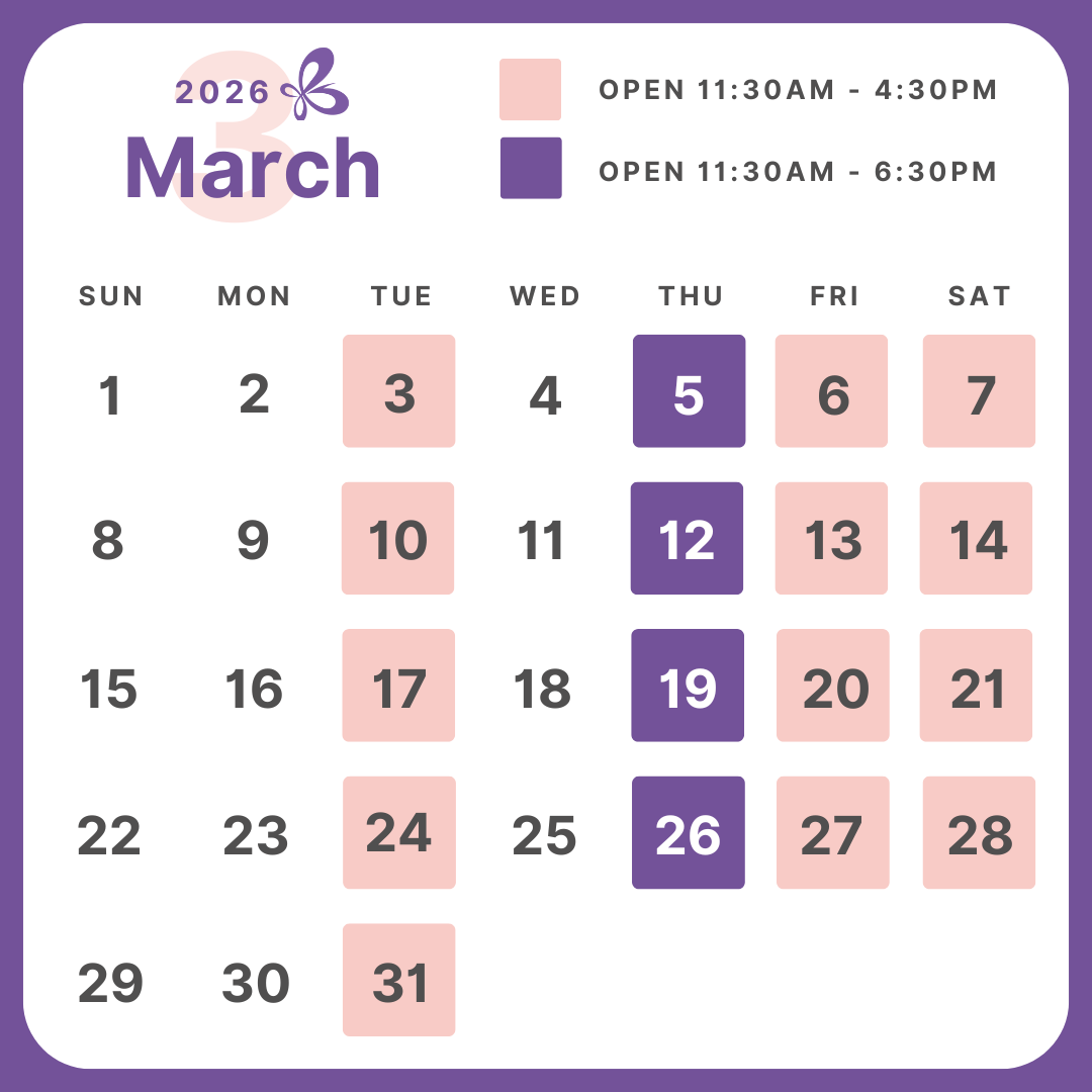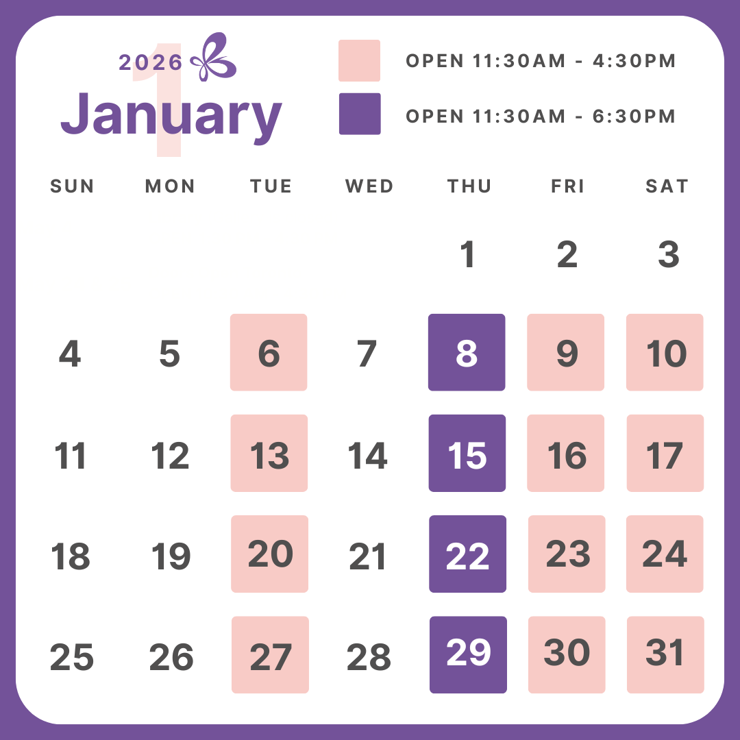| Saturday | 11:30am to 4:30pm *Closed on select Saturdays |