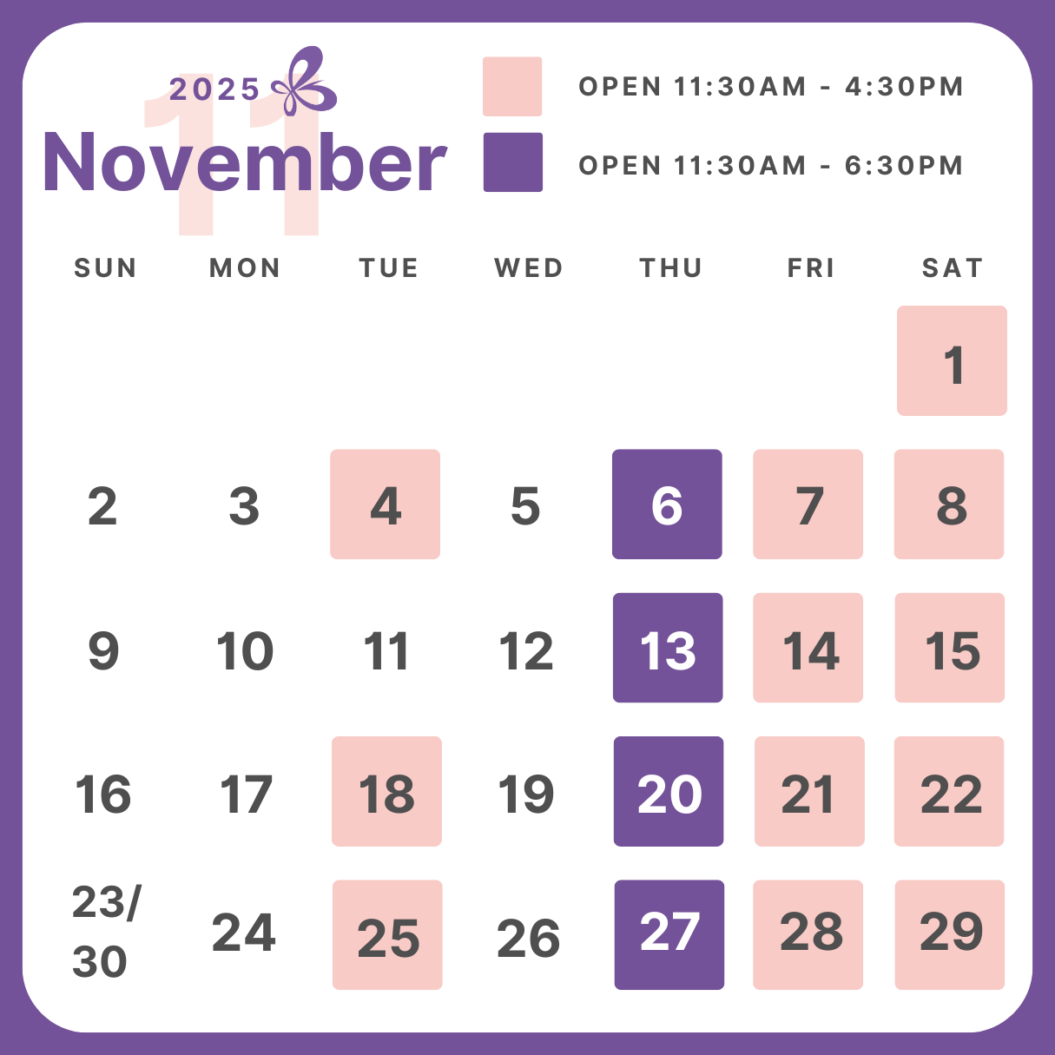 Saturday | 11:30am to 4:30pm *Closed on select Saturdays |