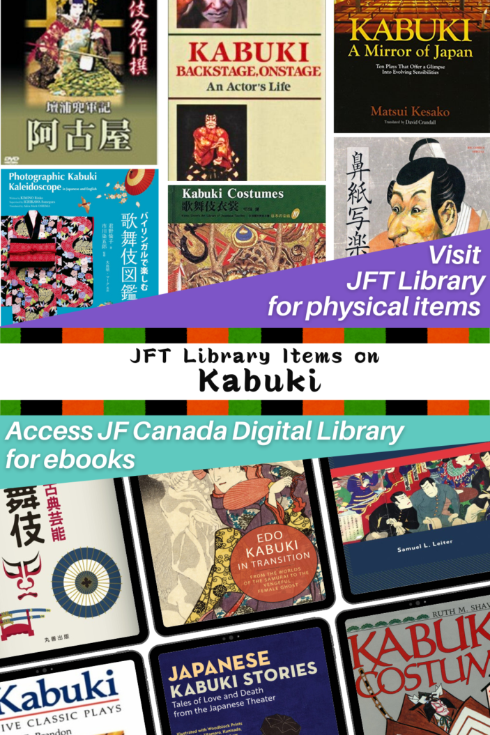 Planning to attend Cinema Kabuki? Whether you are discovering kabuki for the first time or returning as a seasoned theatre lover, this curated selection from the JFT Library invites you to extend your journey into the rich world of kabuki theatre—before and after the event! Discover how kabuki has evolved through the centuries, explore actors’ lives on and off stage, enjoy beautifully illustrated guides to its aesthetics, and watch DVDs/Blu-rays of renowned plays with English soundtracks. Highlights include Kabuki: Five Classic Plays, featuring a full English translation of Princess Sakurahime—perfect for revisiting the drama after the screening or preparing in advance. The library items are available in English and Japanese, across print, DVD/Blu-ray, and ebook formats. The curated library items are currently on display at JFT library. Apply for a new library card or renew your expired card here.