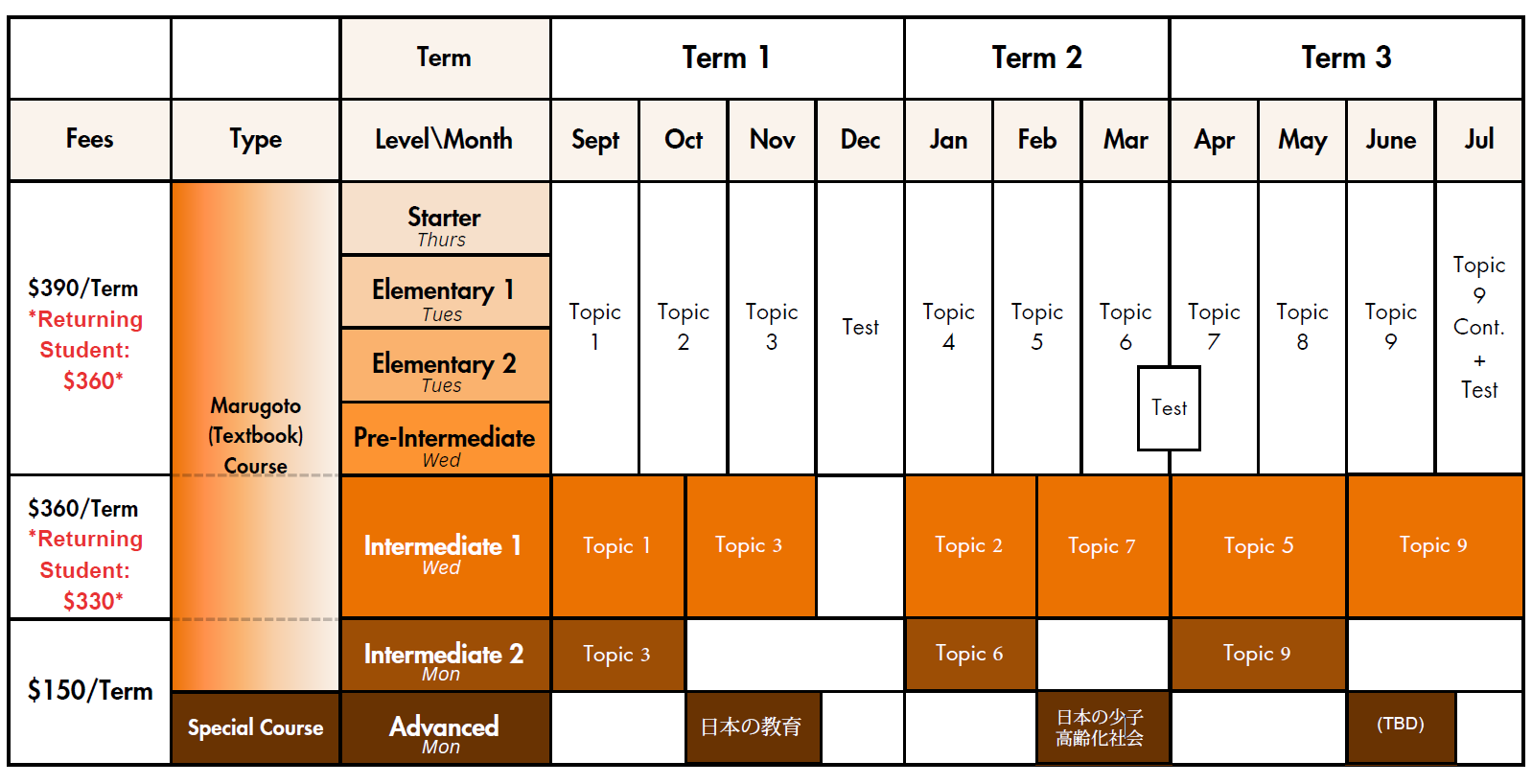 *A placement test may be required depending on the level you register for. Please read the Terms and Conditions for full details. The JFT is introducing a Returning Student Rate for the 2025–26 school year, and this rate will be applicable in each of the 3 terms. Students who have participated in the JFT’s Japanese language classes within the past three years will be eligible for the Returning Student Rate. Please refer to the Terms and Conditions for full details about Returning Student Rate. |