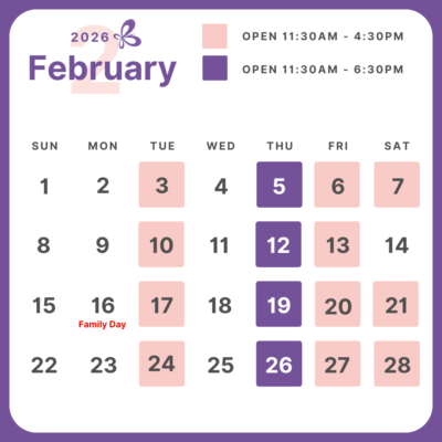 | Saturday | 11:30am to 4:30pm *Closed on select Saturdays |