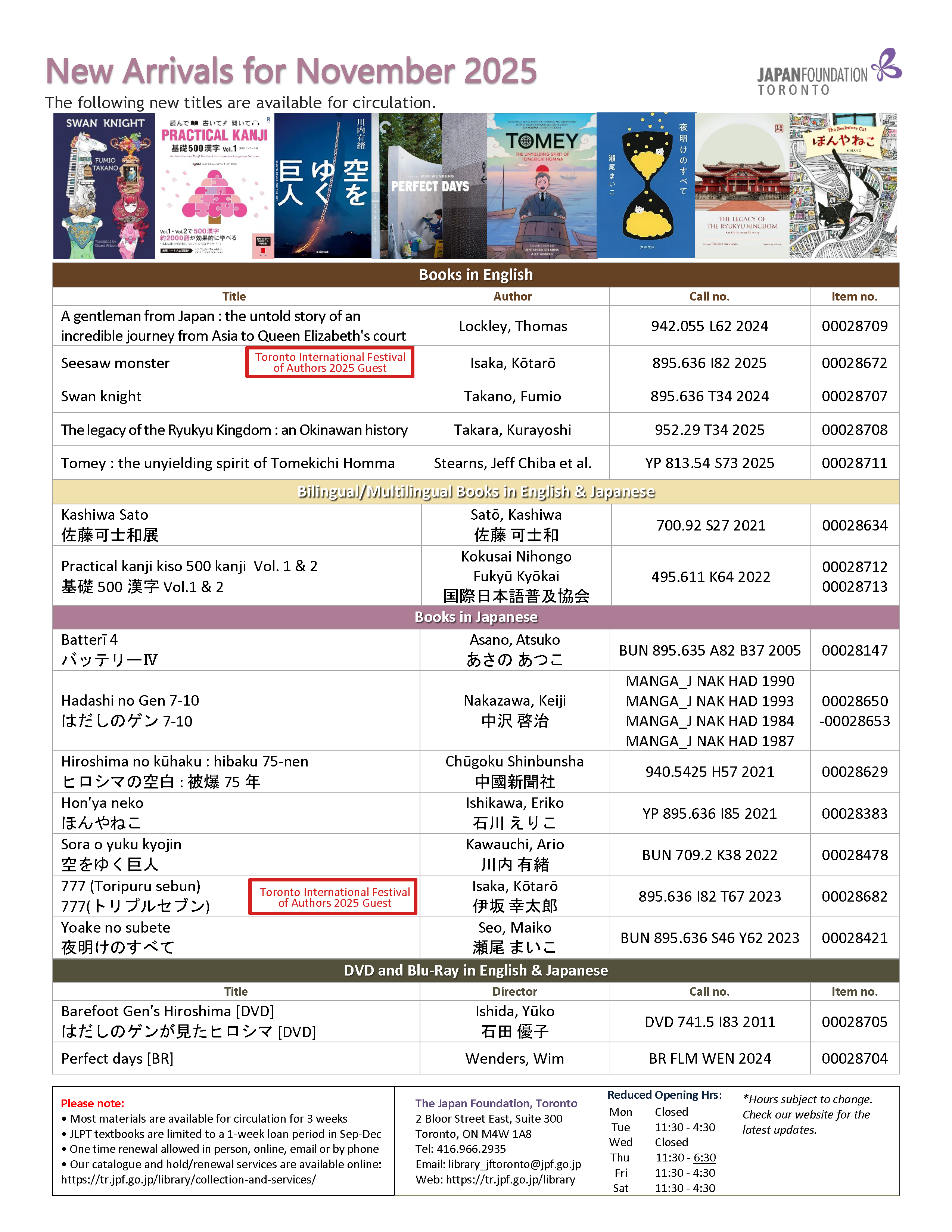Please email library_jftoronto@jpf.go.jp to place a hold for pickup.