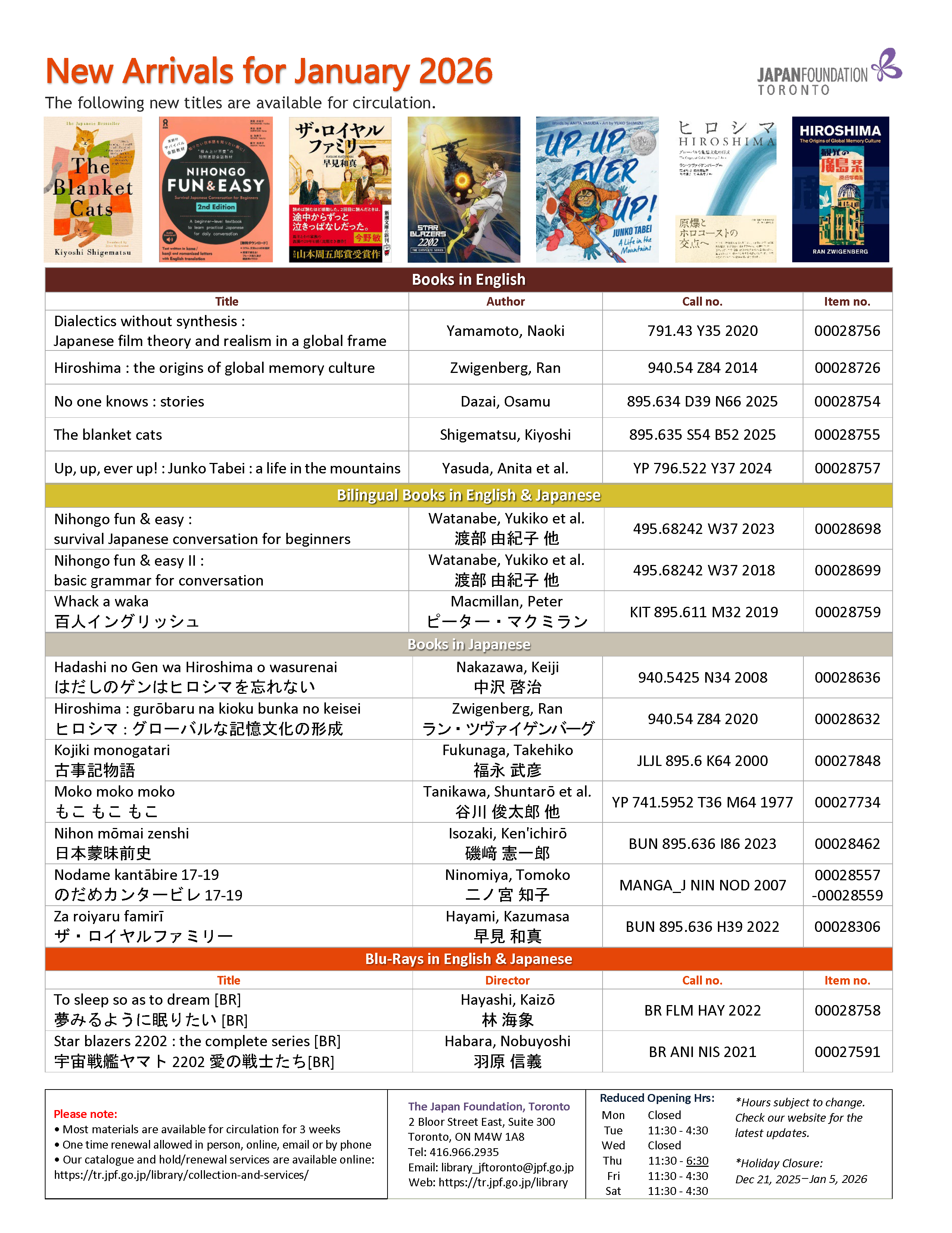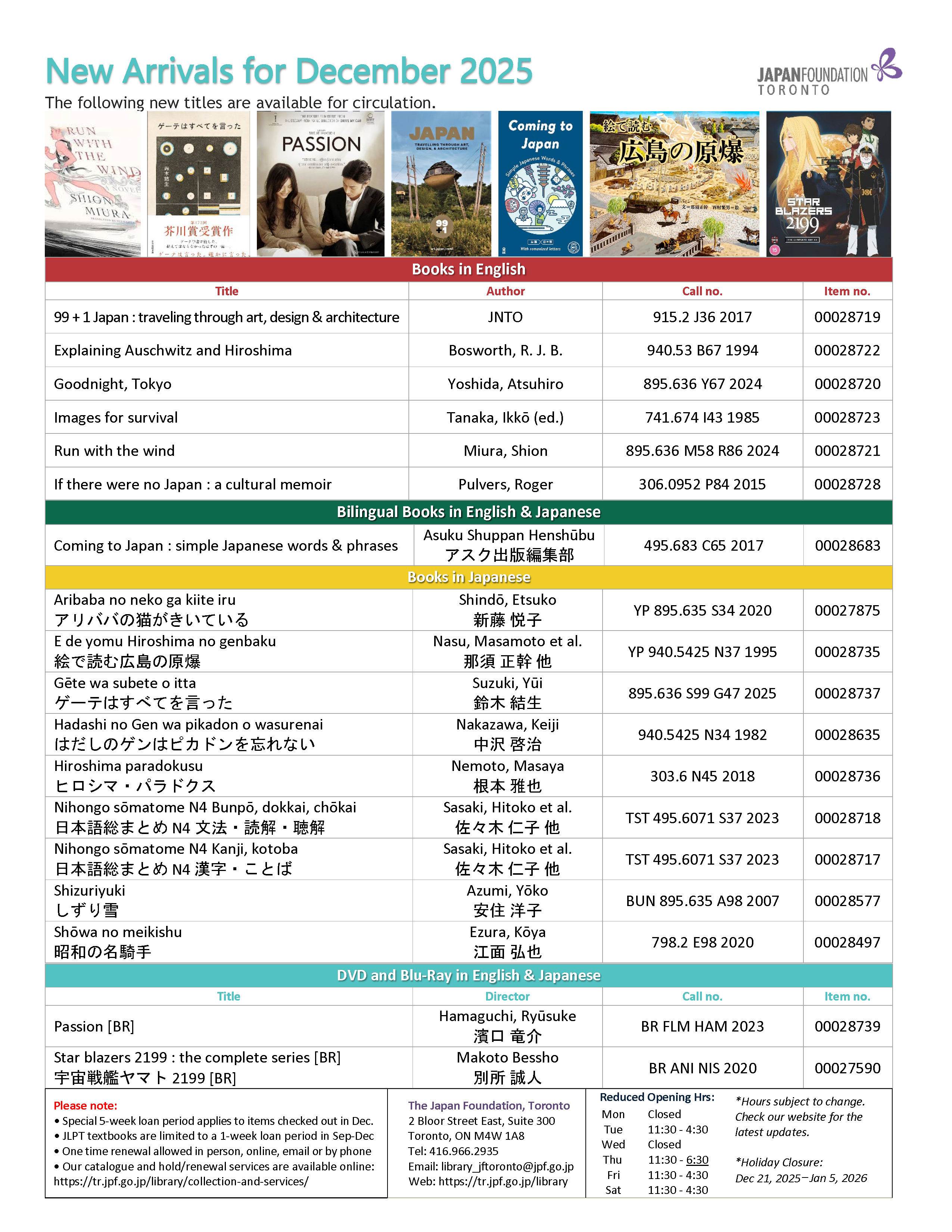 Please email library_jftoronto@jpf.go.jp to place a hold for pickup.
