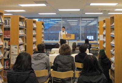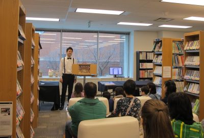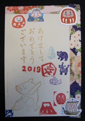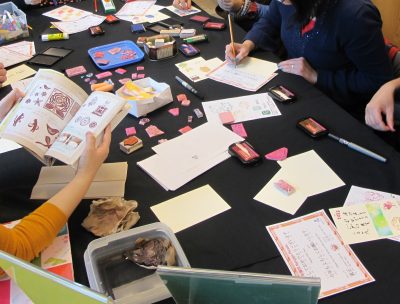 For the first Saturday opening in December, JFT library hosted our annual Nengajo-making workshops. The upcoming year will be the year of the boar, or inoshishi. Visitors enjoyed making Japanese new year’s postcards, learning some Japanese new year’s phrases and kanji, and using our homemade keshigomu stamps. Nengajo workshops alternated with Kamishibai storytelling, performed by Toshiki Mori. He read the seasonal folk tale “Hats for Jizos”.
