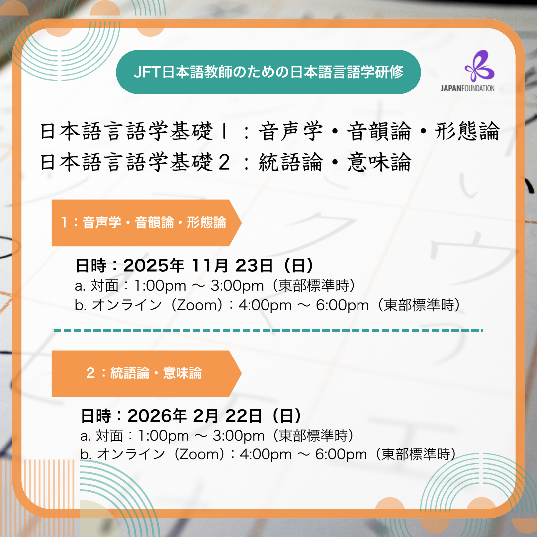 JFT日本語教師のための日本語言語学研修 日本語言語学基礎1:音声学・音韻論・形態論 日本語言語学基礎2:統語論・意味論 日本語言語学の基礎について、日本語教師の目から改めて見直してみませんか。同研修は、同じ内容を対面とオンラインで別の時間に行う予定です。トロント近辺にお住まいの方は対面でのご参加をおすすめします。 日本語教師の方を対象としていますが、日本語教育にご興味をお持ちの方なら、どなたでもご参加いただけます。言語学の専門用語に不慣れな方たちのために、パワーポイントは日本語と英語と両方で準備します。 ご参加をご希望の方は以下の 登録フォーム よりお申込みください。 記 日本語言語学基礎1:音声学・音韻論・形態論 日時:2025年11月23日(日) 対面:1:00pm ~ 3:00pm(東部標準時) オンライン(Zoom):4:00pm ~ 6:00pm(東部標準時) 日本語言語学基礎2:統語論・意味論 日時:2026年2月22日(日) 対面:1:00pm ~ 3:00pm(東部標準時) オンライン(Zoom):4:00pm ~ 6:00pm(東部標準時) ※ 両日ともアクティビティの内容が変わる予定ですので、復習の意味で対面とオンラインの両方参加も可能です。 会場(対面):The Japan Foundation, Toronto (2 Bloor St. E., Suite 300, Toronto, … Continue reading →
